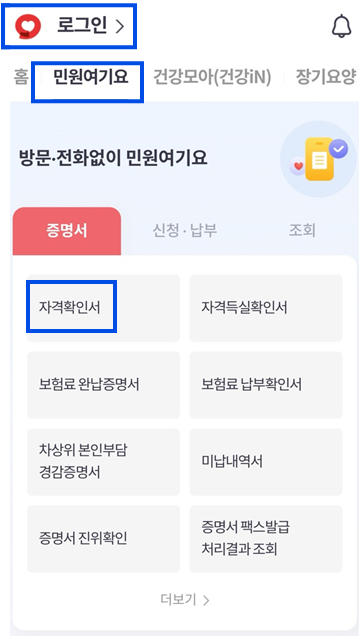 - 건강보험자격확인서 발급: 홈 화면에서 ‘증명서 발급’ → ‘건강보험자격확인서’를 선택 후 발급받습니다.