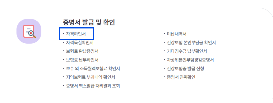 - 증명서 발급 메뉴 선택: ‘민원신청’ → ‘증명서 발급’ → ‘건강보험자격확인서’를 선택합니다.