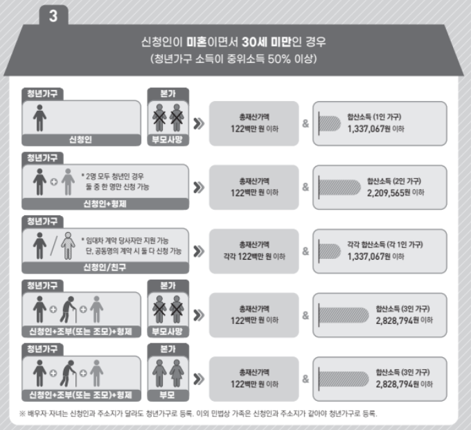 - 주거 조건: 보증금 5,000만 원 이하, 월세 60만 원 이하 주택 거주.